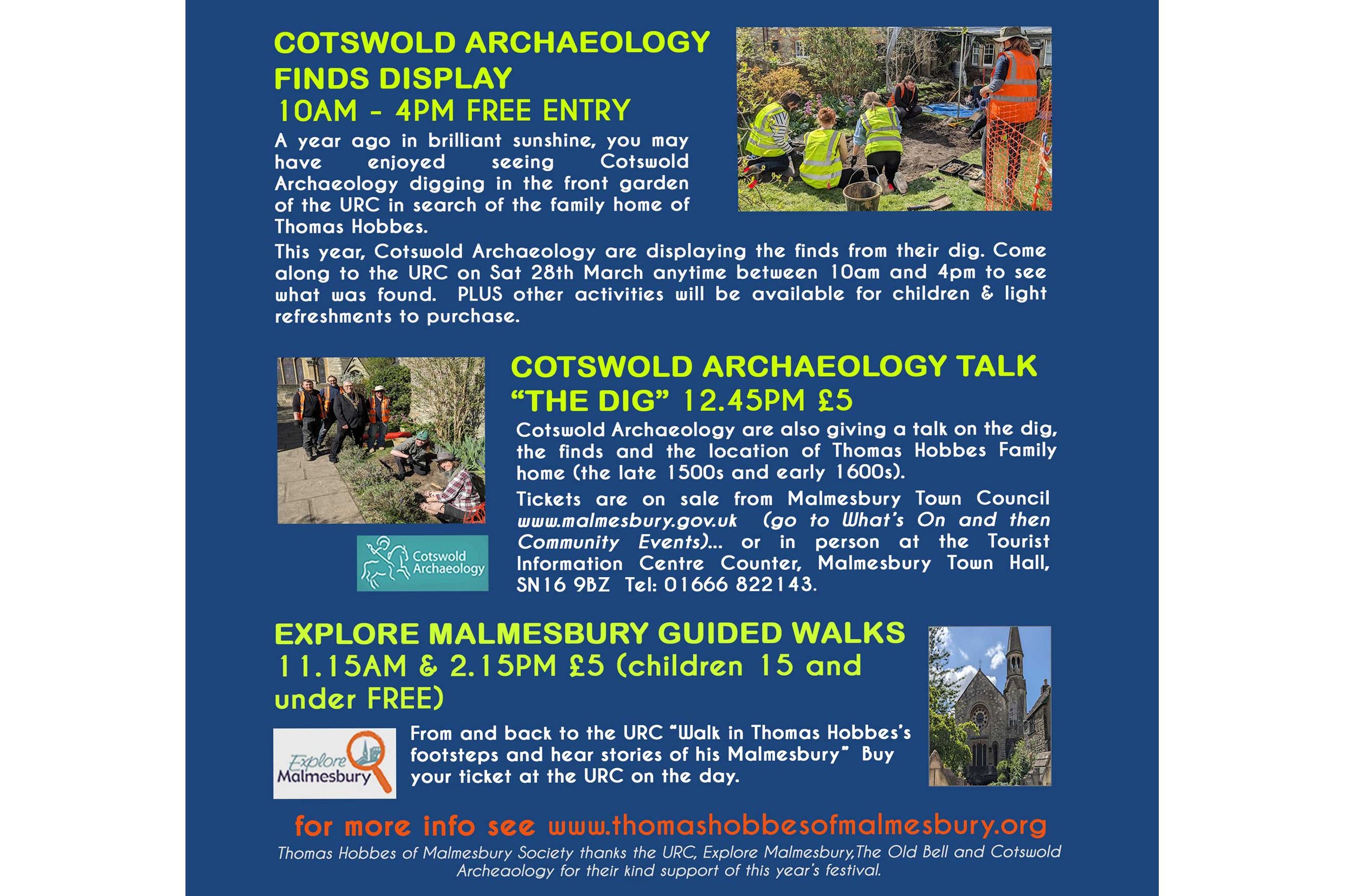 A year ago in brilliant sunshine, you may have enjoyed seeing Cotswold Archaeology digging in the front garden of the URC in search of the family home of Thomas Hobbes. This year, on the 28th March Cotswold Archaeology are displaying the finds from their dig. They are giving us an illustrated talk about the dig which will start promptly at 12.45pm, to fit in with Philosophy Conference lunch break, so please arrive in good time. Tickets are £5 each and are available to purchase online via Malmesbury Town Council’s website here or go to https://malmesbury.gov.uk/what-s-on/thomas-hobbes-festival/whats-on/thomas-hobbes/cotswold-archaeology-the-dig or search for Hobbes under “What’s On”. Tickets may also be purchased from the counter of the Tourist Information Centre at Malmesbury Town Hall.