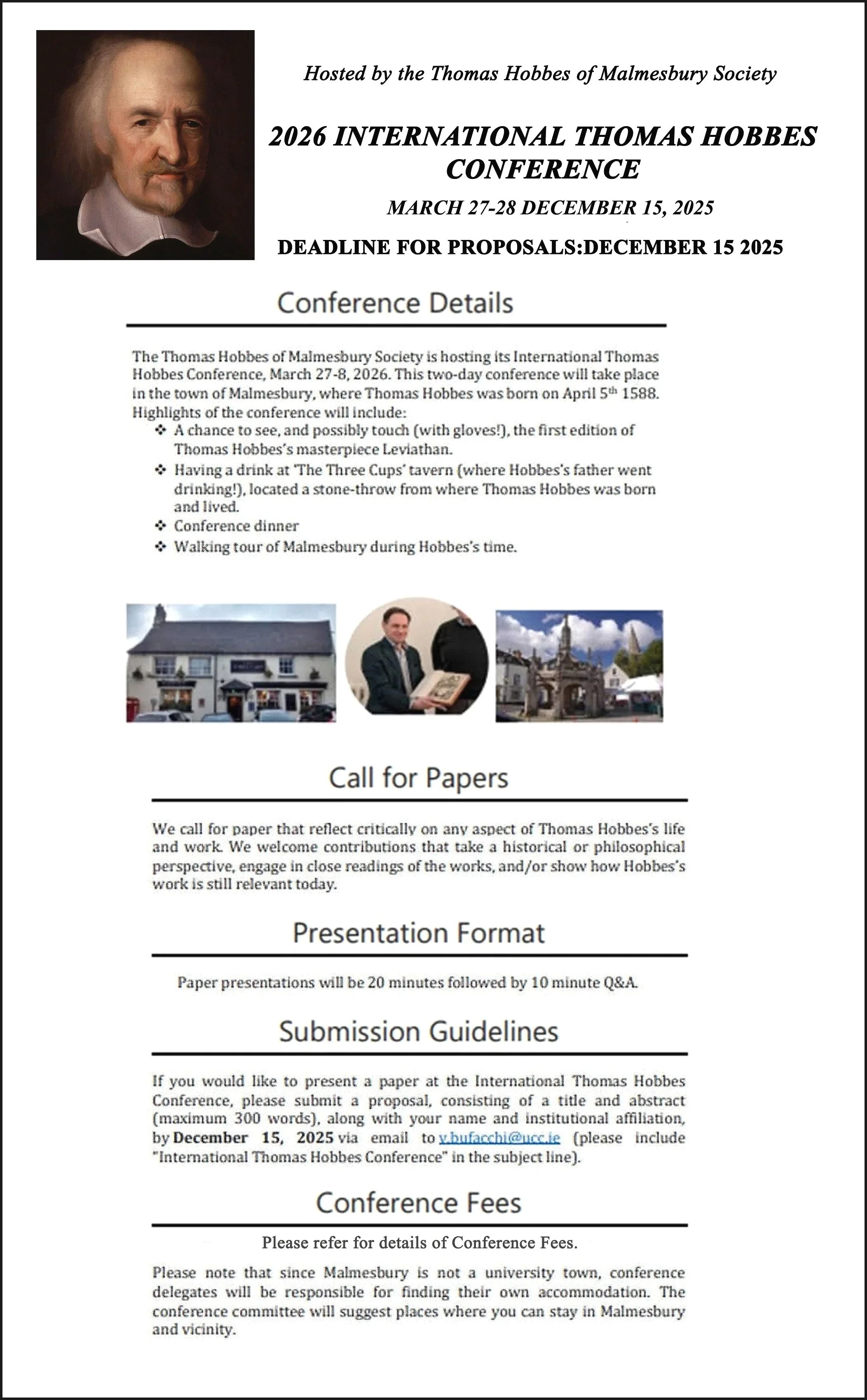 CALL FOR PAPERS - Dr. Vittorio Bufacchi has put out a 'call for papers' to academics for the Conference next year. You can see details and Submission Guidelines below. The deadline for proposals is 15th December. Please email Dr. Bufacchi directly via his contact email v.bufacchi@ucc.ie and please include "International Thomas Hobbes Conference 2026" in the subject line. Deadline for proposals is 15th December 2025.